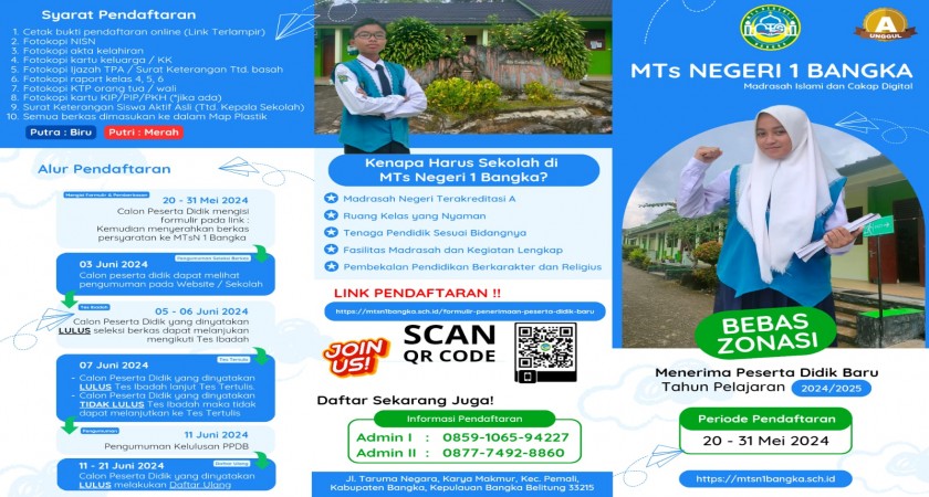 Klik link berikut untuk melihat daftar peserta lolos ppdb MTsN 1 Bangka tahun 2024 https://drive.google.com/file/d/1QxzmkgwnCD48770IXrb8qk-Eki_eyJdD/view?usp=sharing